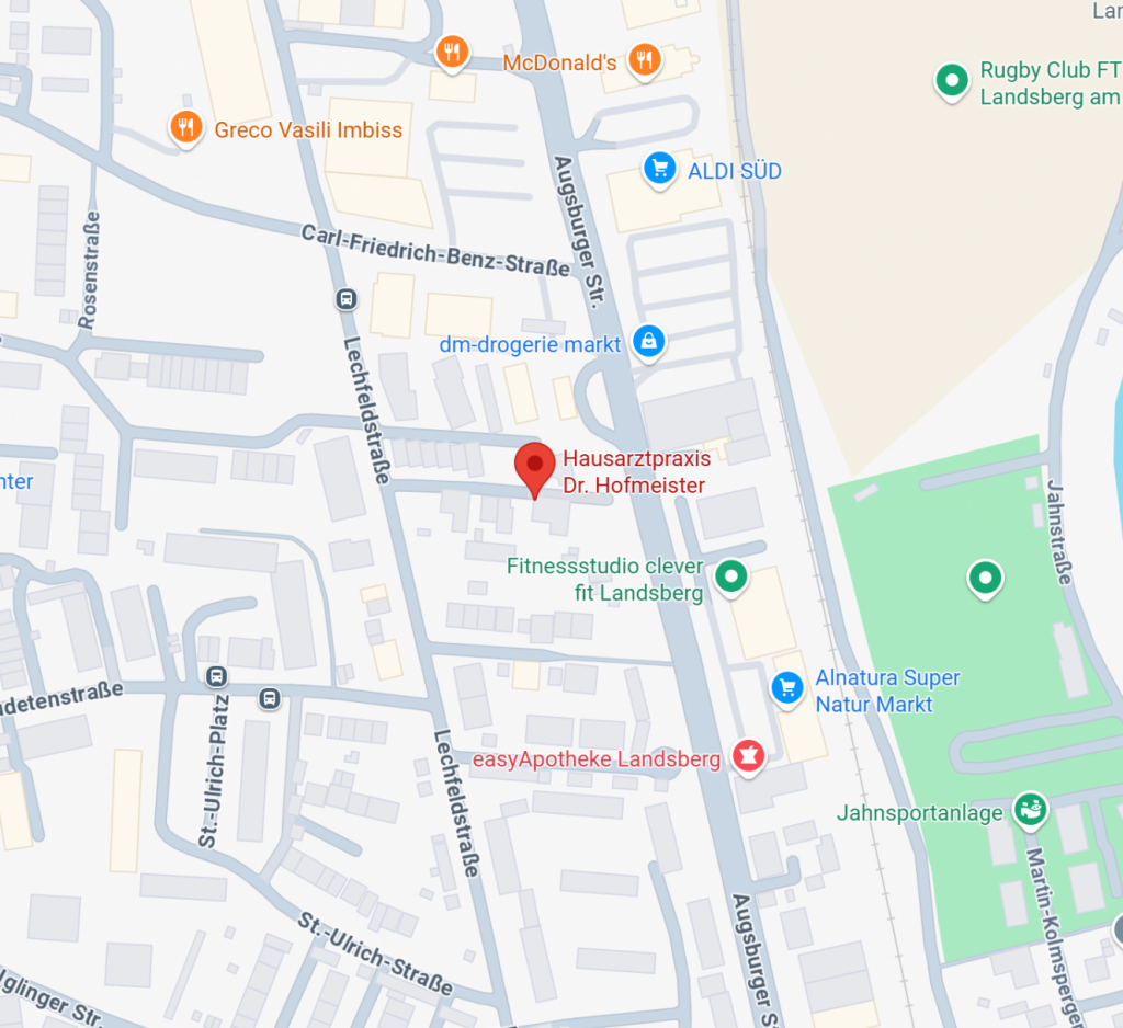 Unsere Praxis befindet sich im Norden von Landsberg am Lech, in der Lechfeldstraße 80 – nur wenige Minuten von der A96 entfernt und damit auch aus dem Umland sehr gut erreichbar. Kostenlose Parkplätze stehen direkt vor dem Gebäude zur Verfügung. Die Anbindung mit öffentlichen Verkehrsmitteln ist ebenfalls gegeben. Die ruhige Lage schafft eine angenehme Atmosphäre für Ihren Besuch.